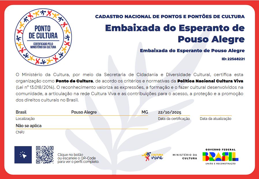 A Embaixada do Esperanto de Pouso Alegre celebra uma de suas mais importantes conquistas institucionais: a obtenção da certificação de Ponto de Cultura, concedida pelo Ministério da Cultura (MinC). O reconhecimento integra oficialmente a instituição à Rede Cultura Viva, valorizando o ensino e a difusão da língua internacional como práticas relevantes para a promoção da diversidade cultural brasileira.